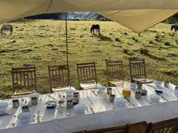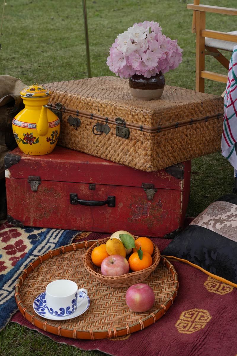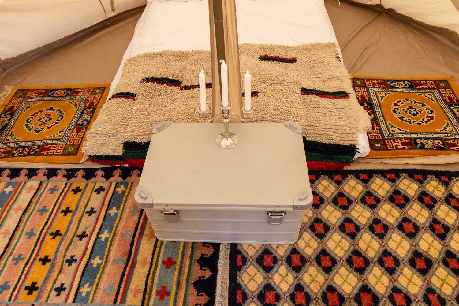 A Bell tent 500 or 600 able to seat up to fifteen guests around a table of colorful dishes. Seated on confortable cushions, the dining tent is decorated with carpets, tablecloth, cloth napkins, candlesticks, oil lamps, and dishes.