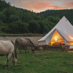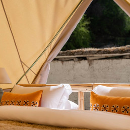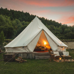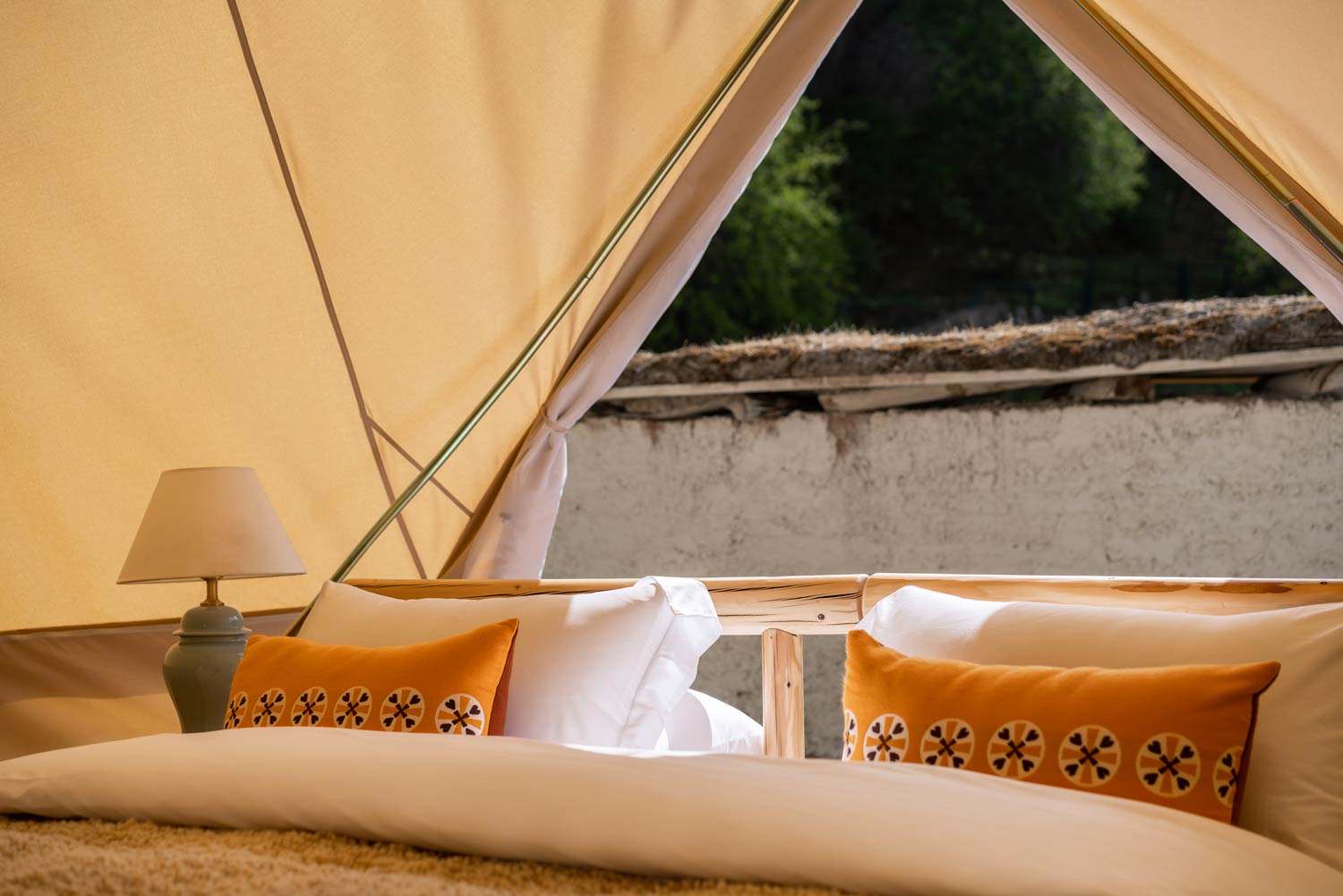 SPENDING A NIGHT UNDER THE STARS in a spacious, heated and delicately organized tent is a dream we all share. The Fixed Camp is adjacent to the Farm Liotard, it remains a true experience for families or groups looking for unusual accommodation. The Bell tents are comfortably furnished and entirely decorated to make your stay memorable.