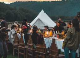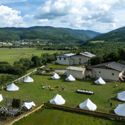 A EVENT DAY for up to one hundred guests in the Ringha Valley where the Farm Liotard is located. In the morning, it is an exceptional and real discovery of Shangri-la and its old town, a lunch at the Flying Tigers Café followed by a crossing of the Ringha valley on horseback to relive the mythical universe of the Tea Road . Visit the Ringha temple and at the end of the afternoon arrival at the Farm where a welcome tea time is served around the camp. Introduction and lecture by Constantin de Slizewicz on the theme of explorers of the last century and the myth of Shangri-la, followed by an aperitif with local charcuterie, dinner presented on a long table in the large Tibetan lounge then vigil around the fire with Tibetan singers and dancers. Possibility to spend the night in tents.