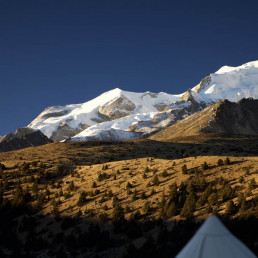 LE MONT GEYEN CULMINANT À 6 200 MÈTRES, est une montagne sacrée majeure du Kham. Cette caravane propose une demi-circumambulation de son massif, dans l’esprit des grands voyages tibétains, où l’on progresse jour après jour autour de la montagne. Les paysages se succèdent sans jamais se répéter : alpages infinis, rivières glaciaires, vallées secrètes et forêts de cyprès tibétains millénaires. Chaque campement est choisi avec soin, face aux sommets ou à l’orée des bois. Plus qu’un trek, il s’agit d’un cheminement, rythmé par la marche, les rencontres et la présence constante de la montagne, avec des campements dignes des explorations d’antan.
